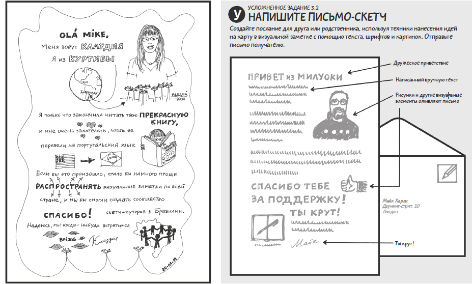 Напишите письмо-скетч. Создайте послание для друга или родственника, используя техники нанесения идей на карту в визуальной заметке с помощью текста, шрифтов и картинок. — Иллюстрация из книги «Визуальные заметки на практике».