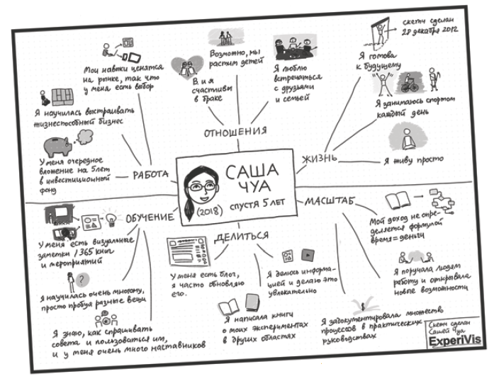 Вы можете использовать скетчи для обозревания вашего прошлого и планирования будущего. Расположите ваше имя и дату, которая наступит через пять лет, в центре страницы, а вокруг — все составляющие вашей жизни, включая работу, семью, отношения, путешествия и другие стороны жизни, которые будут важны для вас спустя пять лет. Прикрепите законченный скетч на видное место, чтобы вы видели ваши цели в будущем каждый день. Каждый год пересматривайте карту и делайте поправки.