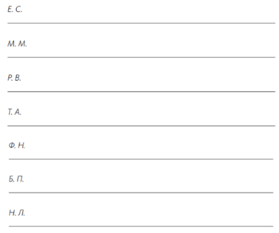 Посмотрите на каждую пару букв, представьте себе, что это инициалы какой-то знаменитости, и запишите в строке ее имя. Например, Ф. Н. может быть Флоренс Найтингейл, М. М. — Мэрилин Монро. Придумайте имена для остальных пар букв.