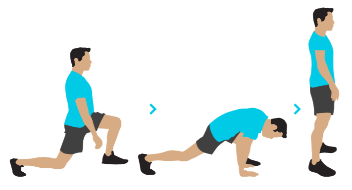 5. Опуститесь грудью к полу насколько возможно, удерживая левую стопу на месте. Затем вернитесь в исходное положение одним движением: оттолкнитесь обеими руками от пола и одновременно, выпрямляясь, приставьте правую ногу обратно к левой.