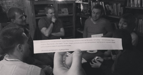 Надя нарезала цитаты из нашего блога (если интересно, какие цитаты, — читайте здесь) и предлагала пришедшим вытянуть. Получилось здоровское гадание! Прелестной читательнице Алисе досталась цитата из книги Барбары Шер «О чем мечтать»: «Сравнивать человеческие существа между собой можно не больше, чем розы с апельсинами, горы с морем, Францию с Англией. Только ваши уникальные и неповторимые черты могут служить базой для создания вашей идеальной жизни». Алиса написала, что это оказалась не просто игра, а мысль октября. В конце вечера прилетела стайка студентов из Москвы: случайно узнали о квесте #миф_в_лицах и принялись отгадывать загадку.