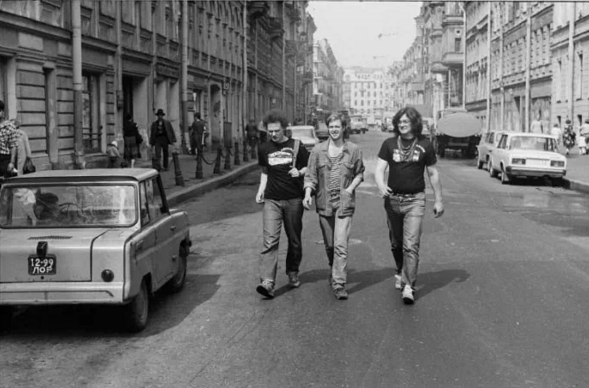 1. Улица, на которой находится загаданное кафе, можно назвать литературной: здесь жили, например, Сергей Довлатов и Ольга Берггольц (впрочем, литературными являются многие улицы в центре нашего города). Думаю, многие узнали на этой фотографии 80-х годов группу Аквариум (кстати, эта улица выбрана группой для «фотосессии» не случайно).
