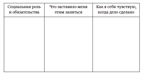 Вспомните все ваши социальные роли, все возложенные на вас обязательства и добровольные занятия. Заполните таблицу и честно признайтесь себе в возникающих эмоциях.