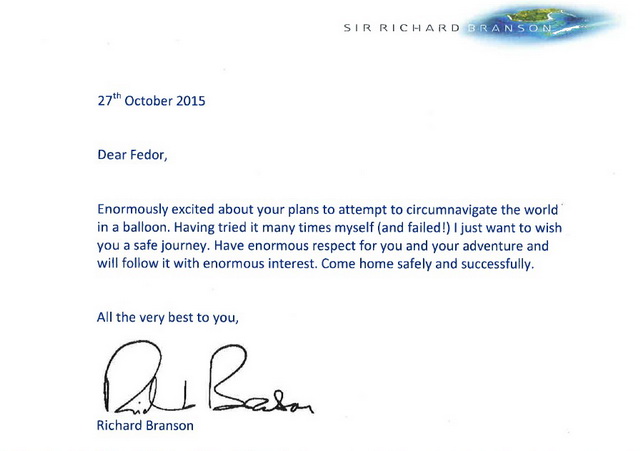 Приятной новостью поделился на своём сайте путешественник Фёдор Конюхов. Оказывается, в конце октября ему пришло письмо от другого авантюриста — Ричарда Брэнсона, автора бестселлера «К черту все! Берись и делай!». В письме Ричард Брэнсон желает удачи Фёдору Конюхову в его намерении обогнуть весь мир на воздушном шаре.