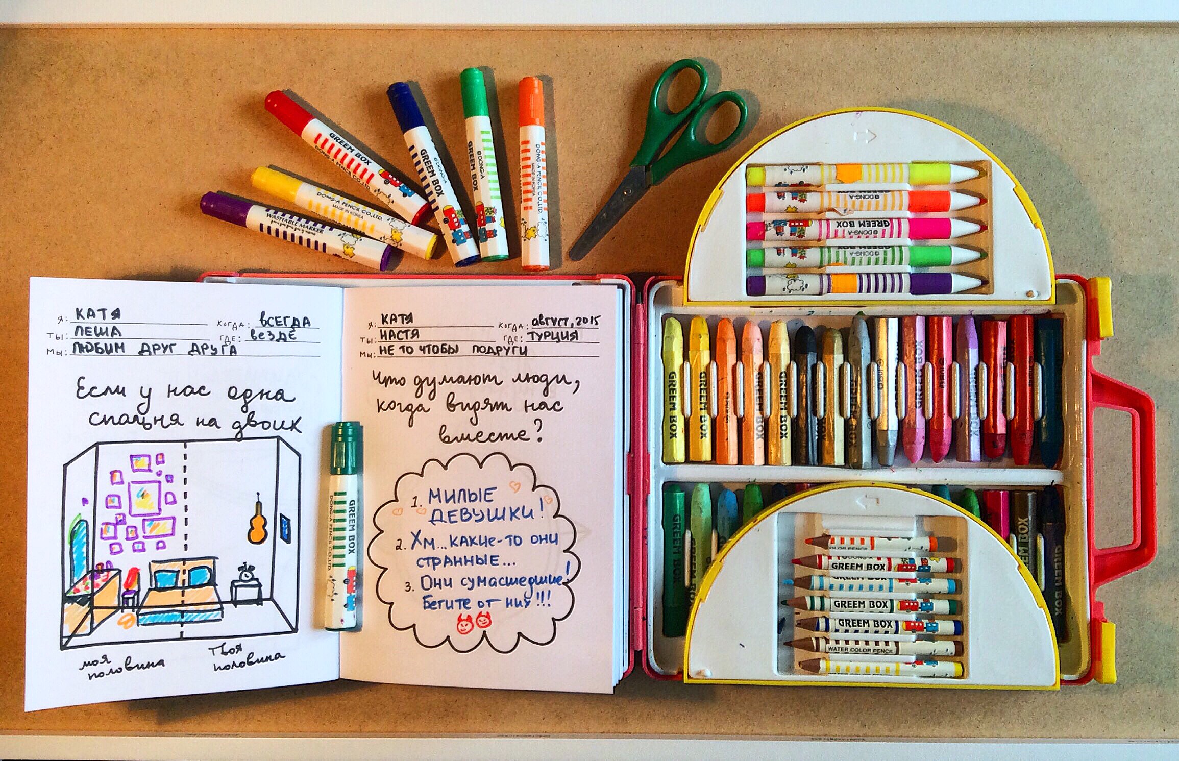 Можно писать шариковыми ручками. Но почему бы не добавить немного красок? Раздобудьте несколько цветных карандашей и фломастеров. Найдите коробку разноцветных гелевых ручек. Поделитесь своими карандашами и ручками друг с другом.