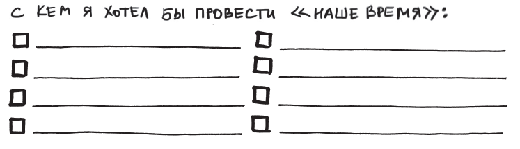 Каждая страница предназначена для того, чтобы заполнять ее вдвоем. Это вы и кто-нибудь еще. Разумеется, можно заполнять книгу с одним, особенным человеком, но если вы хотите сделать праздничный подарочный экземпляр вместе с компанией людей, которые вам нравятся, напишите список их имен и затем постепенно их вычеркивайте.