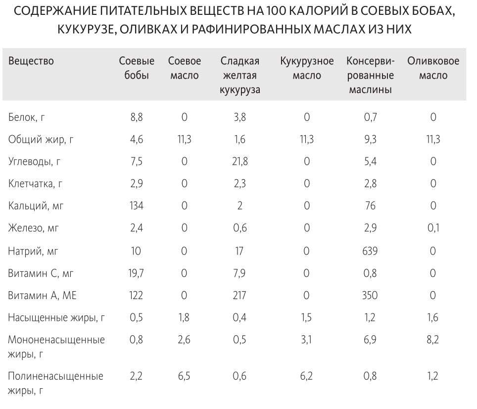 Почему это важно? Потому что очевидно, что в неестественных продуктах с чистыми жирами очень мало веществ, однозначно полезных для здоровья. При этом они — самые богатые энергией продукты на планете. Здесь та же история, что с продуктами с чистым сахаром, о которых говорилось выше. Сравните в таблице ниже содержание питательных веществ в цельных соевых бобах, соевом масле, цельной кукурузе и кукурузном масле, а также в оливковом масле и самих оливках.