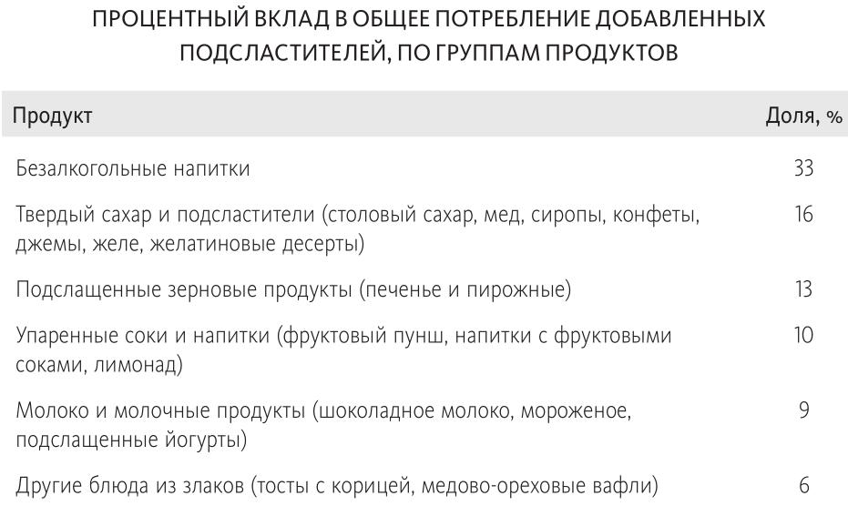 По нескольким параметрам потребление сахара за последние 30 лет существенно выросло. Мы получаем из него 11–20% всех калорий, при этом молодежь ближе к верхней границе, а пожилые — к нижней. В таблице показано, откуда этот сахар берется.