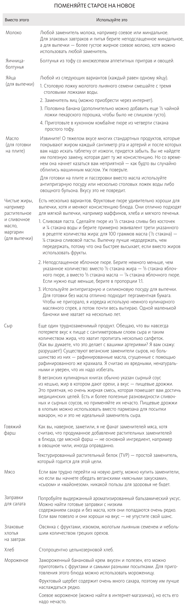 Очень полезно знать некоторые базовые принципы, позволяющие готовить более здоровую пищу с помощью имеющихся рецептов и кулинарных книг. В таблице ниже приведены самые важные заменители и методики, которые вам надо знать, чтобы вести более здоровый образ жизни.