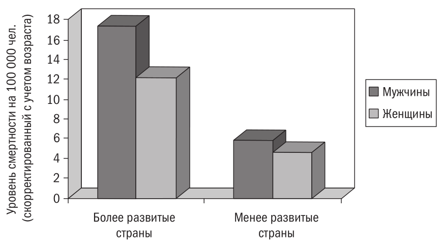 На рисунке сравниваются показатели среднего уровня смертности в странах с более высоким и более низким развитием; все они скорректированы с учетом возраста.