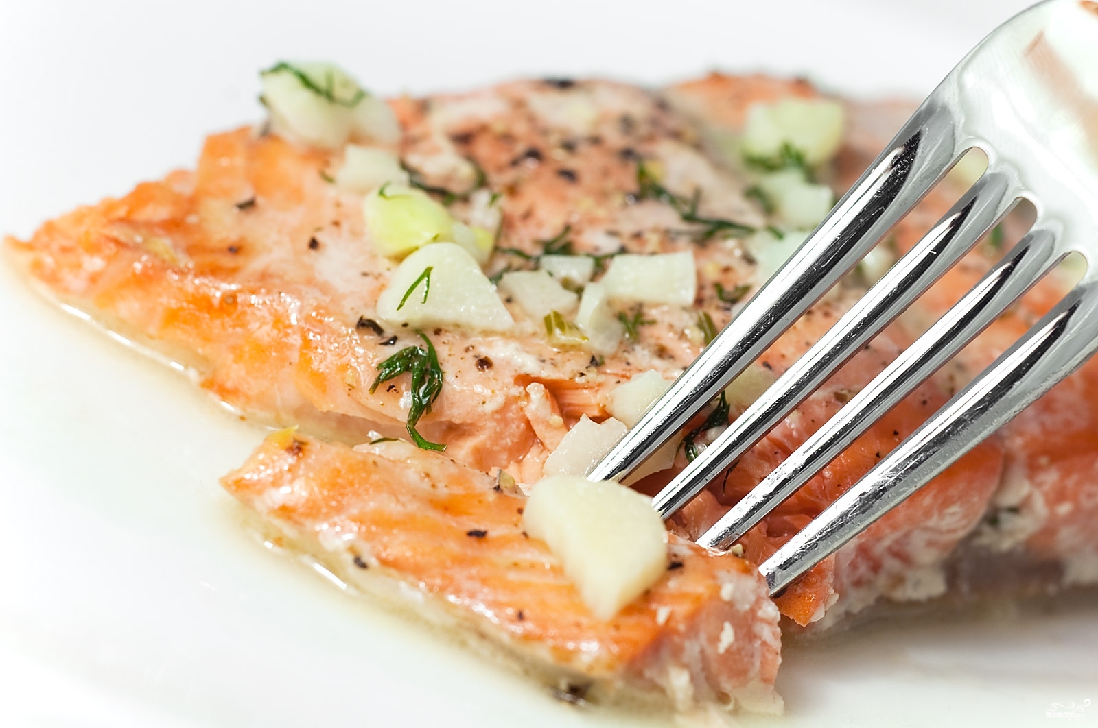 1. Семгу нарежьте на куски, посолите, посыпьте специями.