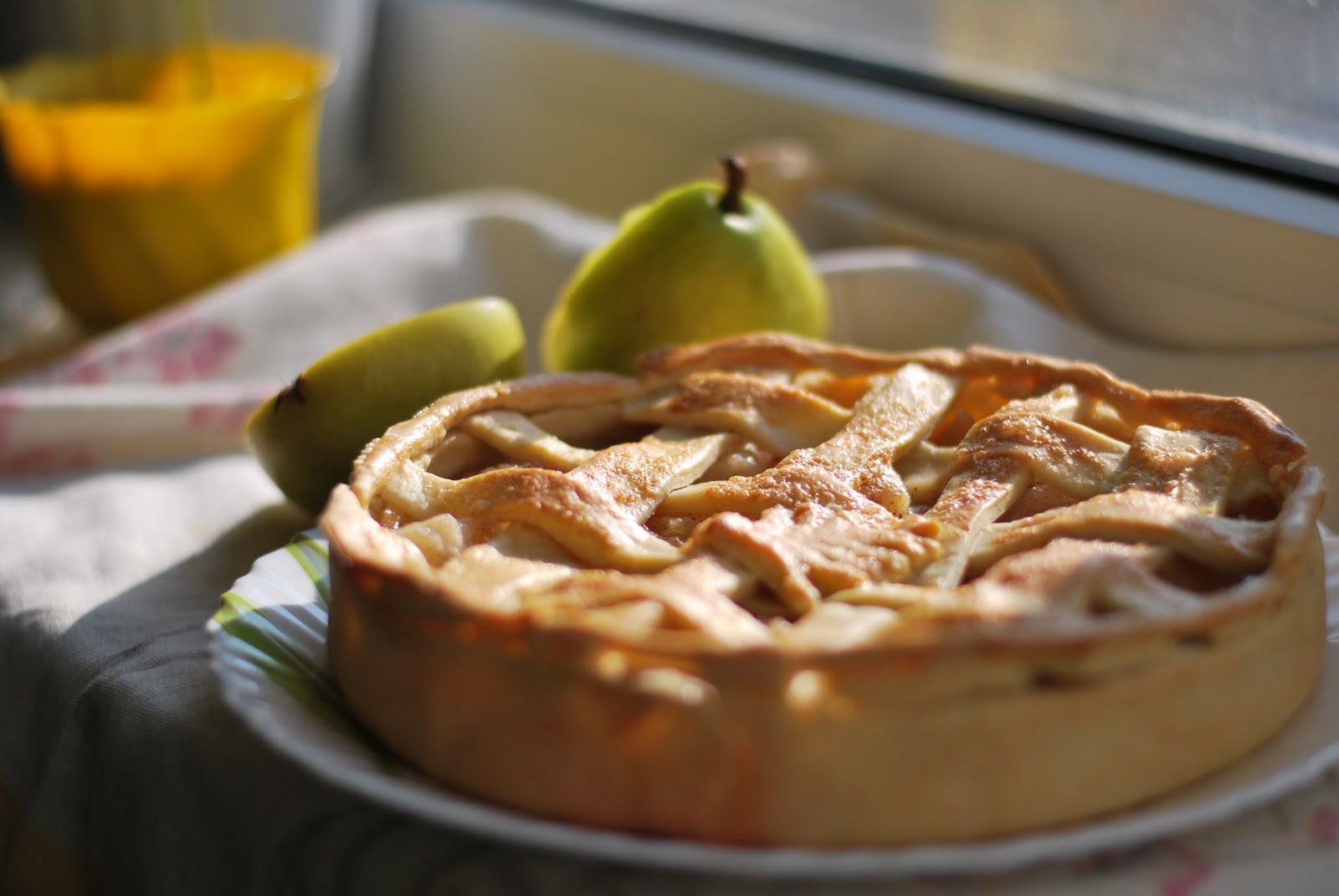 Грушевый пирог со сметаной и грецкими орехами (рецепт из книги «Пироговедение для начинающих»).
