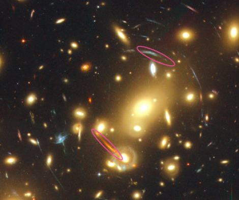 Темная материя в скоплении галактик Abell 2218 гравитационно линзирует свет от более далеких галактик. Изображения линзированных галактик дугообразны (обведены фиолетовыми овалами), подобно изображениям, которые видны при гравитационном линзировании Гаргантюа. Иллюстрация из книги
