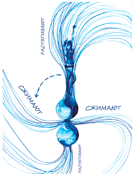 Когда дыры вращаются одна вокруг другой, они увлекают следом свои тендекс-линии, которые походят на струи воды из крутящейся поливалки на газоне. На рисунке из книги «Интерстеллар. Наука за кадром» — пара черных дыр, которые сталкиваются, вращаясь одна вокруг другой против часовой стрелки, и их тендекс-линии.