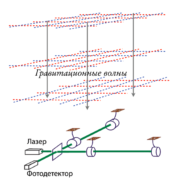 Когда эти волны достигают Земли, они имеют вид, показанный в верхней части рисунка ниже. Они растягивают в одном направлении и сжимают в другом. Растяжения и сжатия колеблются (от красного вправо-влево, к синему вправо-влево, к красному вправо-влево и т. д.) по мере того, как волны проходят через детектор в нижней части рисунка.