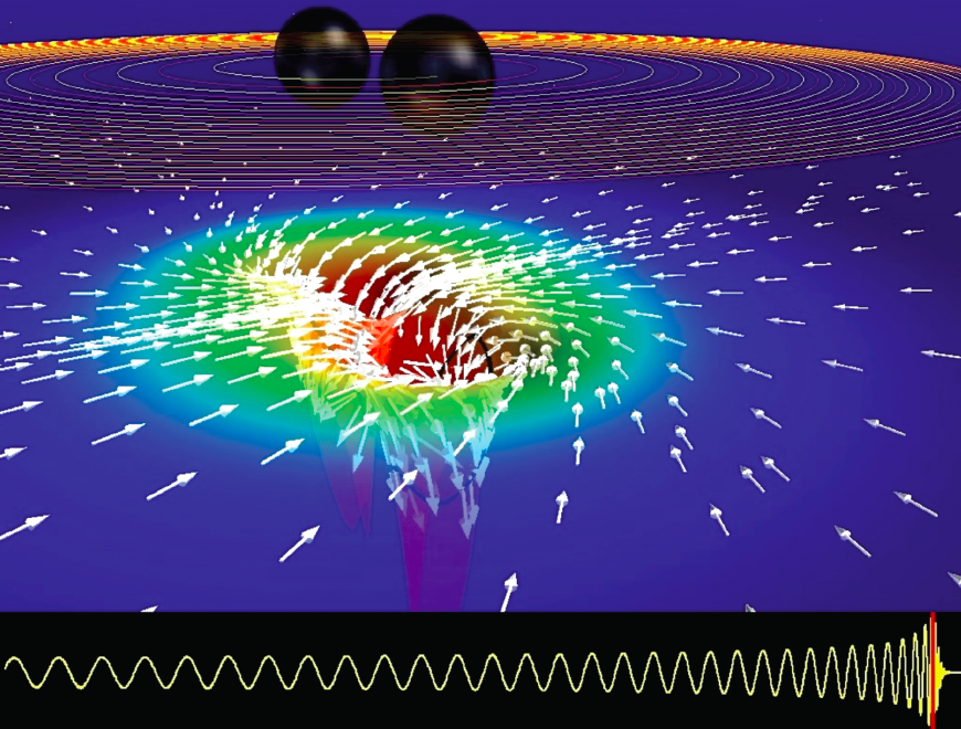 На рисунке выше изображен момент столкновения двух черных дыр. Как раз такое событие позволило ученым зафиксировать гравитационные волны. Эта модель построена для невращающихся черных дыр. Сверху: орбиты и тени дыр, вид из нашей Вселенной. Посередине: искривленное пространство и время, вид из балка (многомерного гиперпространства); стрелками показано, как пространство вовлекается в движение, а изменяющимися цветами — как искривляется время. Снизу: форма испускаемых гравитационных волн.
