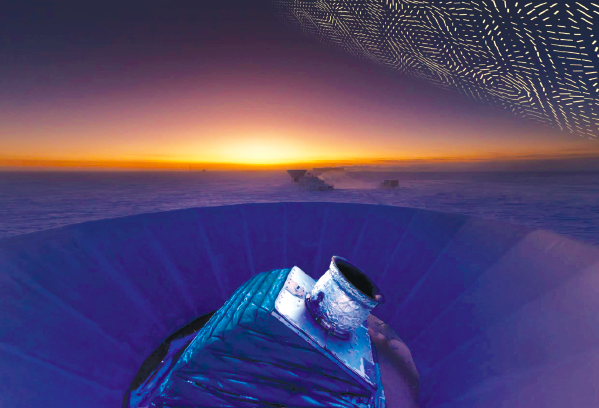 Он окружен щитами, экранирующими аппарат от излучения окружающего ледяного покрова. В правом верхнем углу показан обнаруженный в реликтовом излучении след — поляризационный узор. Линии электрического поля направлены вдоль коротких светлых штрихов.