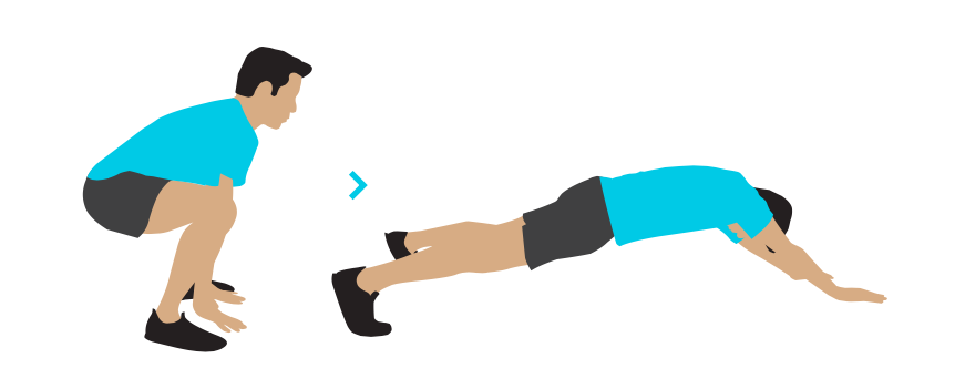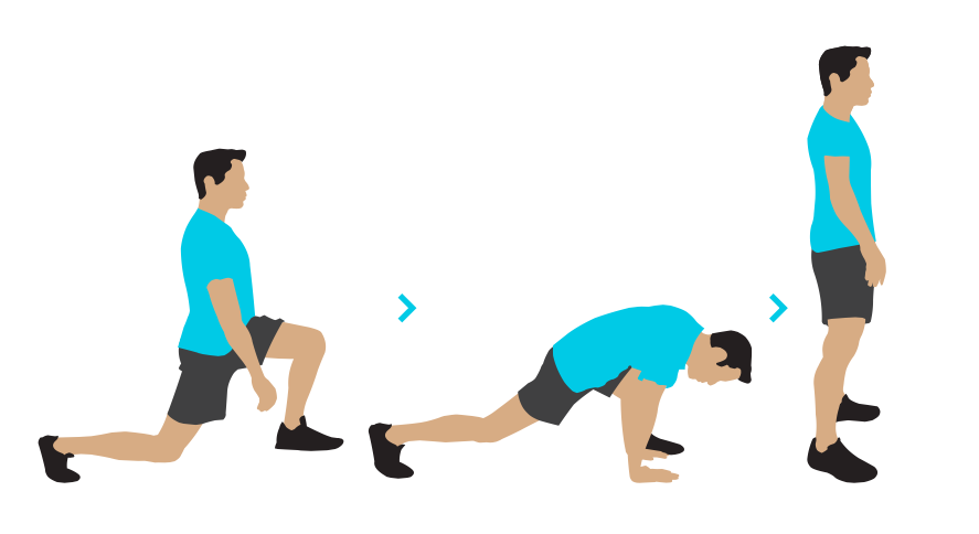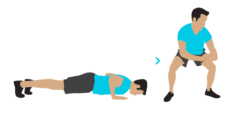 5. Опуститесь грудью к полу насколько возможно, удерживая левую стопу на месте. Затем вернитесь в исходное положение одним движением: оттолкнитесь обеими руками от пола и одновременно, выпрямляясь, приставьте правую ногу обратно к левой.