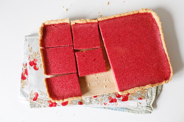 Полученную смесь вылейте на горячую основу и верните пирог в духовку, уменьшив температуру до 160°С. Пеките 40 минут, начинка должна стать густой у краев, а в серединке — похожей на желе.