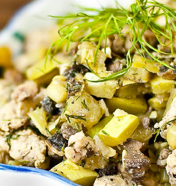 Вкусное и достаточно легкое блюдо, к которому можно подать рис или пасту, если нужен углеводный гарнир. Готовится в соке от грибов и кабачков, поэтому продукты не получаются зажаренными. Можно взять курицу или индейку.