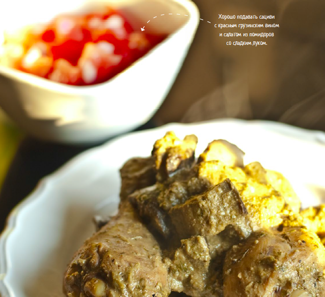 Сациви – это название пряного грузинского соуса из грецких орехов и зелени. Часто его загущают желтками или мукой. Но это не принципиально для вкуса, а только добавляет калорий, и в случае с мукой – не совсем здесь уместных простых углеводов. Пряности играют в соусе исключительно важную роль. Обязательными считаются корица и шафран, хотя и не всем нравится сочетание корицы с мясом. Вместо хмели-сунели можно взять смесь семян кориандра, лаврового листа, острого и черного перца. Иногда добавляют гвоздику, молотый жгучий перец. Главное, пряностей должно быть много, тогда и блюдо получится насыщенно пряным.