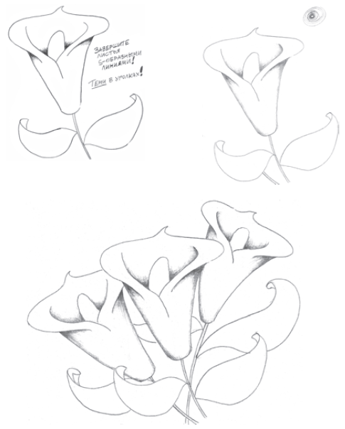 7. Нарисуйте нижние части листьев при помощи чуть сильнее изогнутых S-образных линий. Определите место для источника света и прорисуйте тени в уголках. Именно в этот момент рисунок на плоском листе бумаги получает третье измерение.