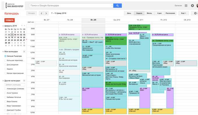 В 8:55 мой календарь сообщает о том, что через 5 минут у меня начнется плановая встреча. Календарь мы «прошиваем» на неделю вперед, раскидываем в нем свои задачи и встречи. Все мои коллеги могут посмотреть мой календарь и в свободное время пригласить меня на встречу.