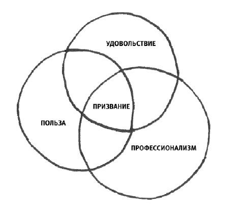 Можно воспользоваться методом ПУП. Посмотрите на рисунок. Все три круга — «Профессионализм», «Удовольствие» и «Польза» — пересекаются в центре. Область их пересечения и есть ваше призвание.