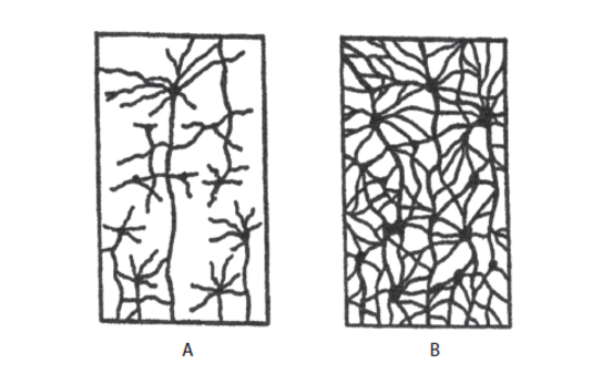 На рисунке А — отражение связей клеток мозга среднего человека, работающего над проблемой, а В — отражение связей клеток мозга, постоянно стимулируемых записью и ана­лизом информации. Иллюстрация из книги