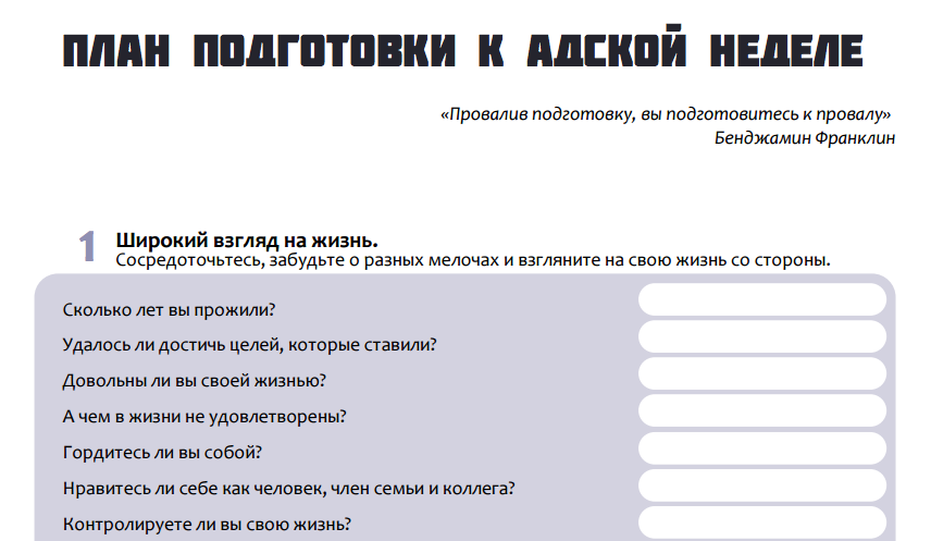 Вот такой план подготовки, куда можно записывать все, что пригодится на Адской неделе, получают те, кто участвует в марафоне МИФа. Пригодится он и во время интенсива.