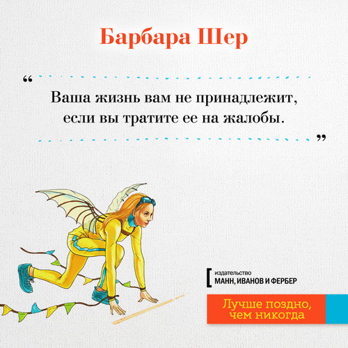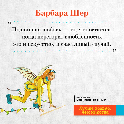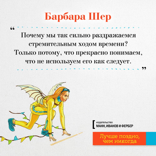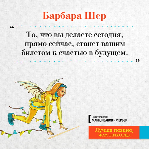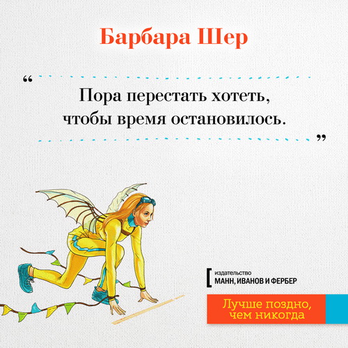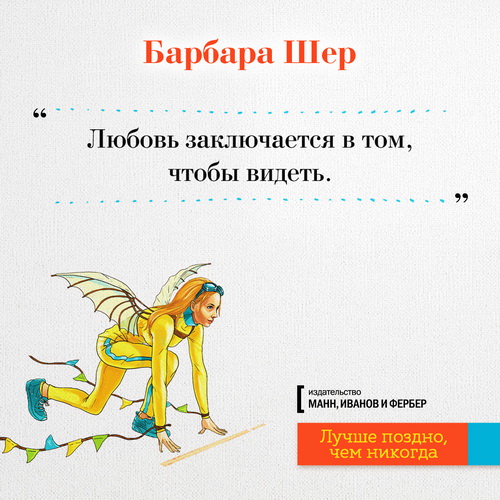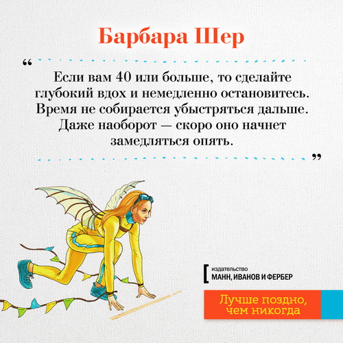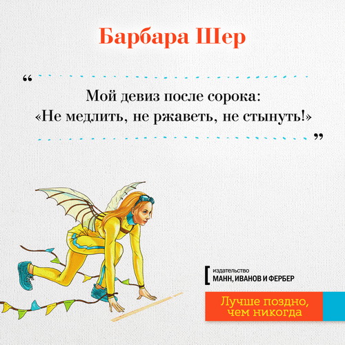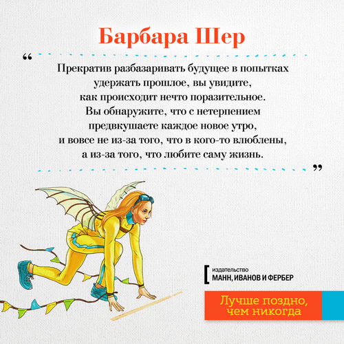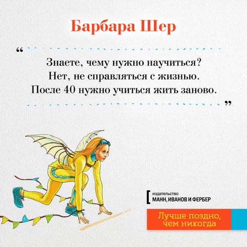Друзья, мы сделали открытки по новой книге Барбары Шер «Лучше поздно, чем никогда», в которой она доказывает: никогда не поздно начать новую жизнь! Средний возраст — отличное время, чтобы заняться любимым делом и стать свободным.
