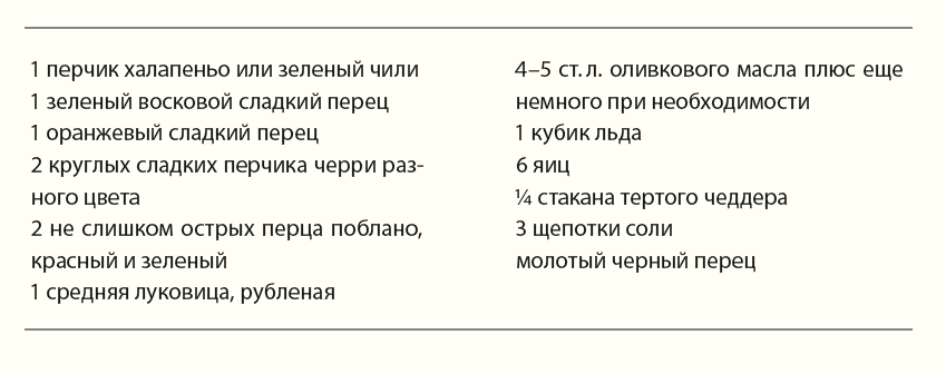 Весь перец крупно порубите. Возьмите немного смеси перцев разных цветов и из- мельчите — должно получиться примерно 3 столовые ложки; отложите. Точно так же измельчите лук — 3 столовые ложки — и отложите.