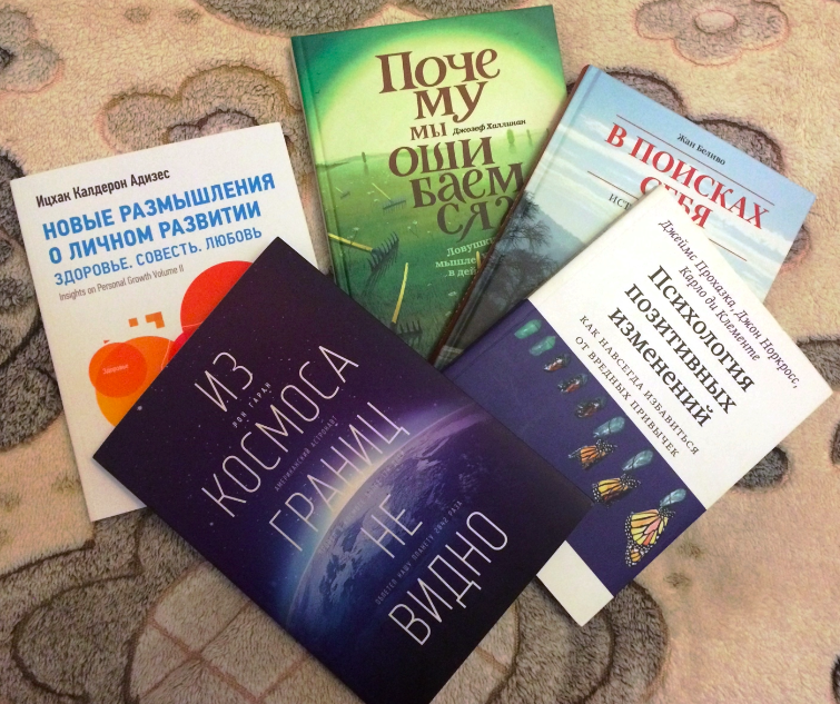 — Ещё я однажды выиграла «Психологию позитивных изменений». Посылку как ребёнок ждала. Недавно совсем купила себе «Из космоса границ не видно». Только собираюсь читать. На обложку любуюсь. Вот «Ловушки мышления» закончу…