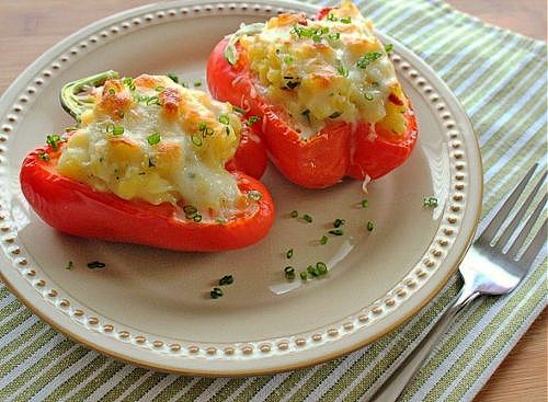 С готового картофеля слейте воду, добавьте соевого молока и тщательно разомните картофелемялкой или вилкой. Добавьте зеленый лук и кукурузу и перемешайте. Посолите и поперчите по вкусу. Выложите картофельное пюре в половинки перцев и выпекайте до золотистой корочки — около 20 минут