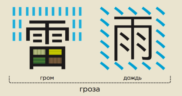 То же самое происходит, если объединять несколько разных иероглифов. Например, совместное написание слов «гром» и «дождь» означают 雷雨 — «гроза»: