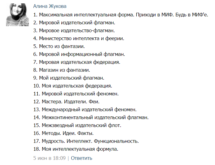 МИФ — это издательство? Вы уверены? А может быть, это многоликая интеллектуальная фабрика или министерство интеллектуальных финансов? В общем, мы решили повеселиться и спросили у наших читателей, как бы они расшифровали знаменитую аббревиатуру МИФ.