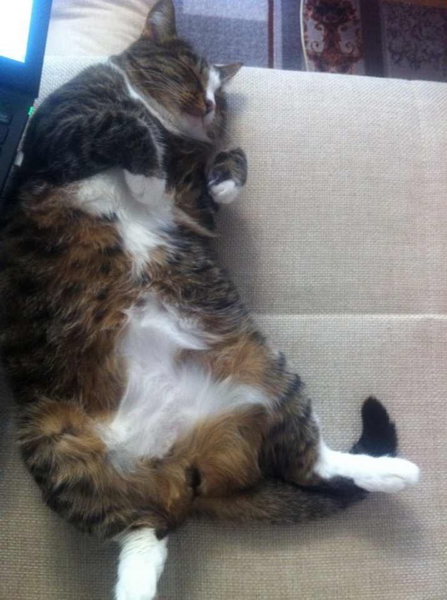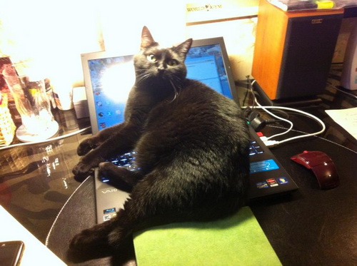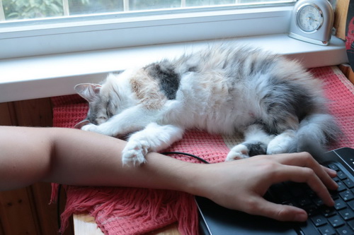 Мюмзик очень общительный и обожает поудобнее улечься на руках Оксаны, пока она работает за компьютером. Правда постепенно кот оказывается лежачим на клавиатуре 🙂