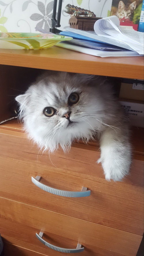 Когда Женя работает, Фил как порядочный кот любит ей помогать. Конечно же, он любит прилечь на ноутбук или принтер, но так как делать это запрещено (на столе же важные бумаги, которые очень хочется попробовать на коготь!), он нашел выход и теперь ждёт, когда хозяйка наработается в ящике стола.