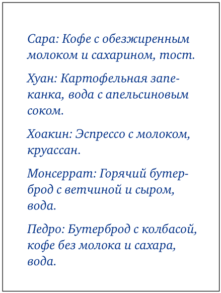 3. Группа друзей отправилась обедать вместе. Прочитайте заказ и запомните его. После чего продолжайте читать задание.