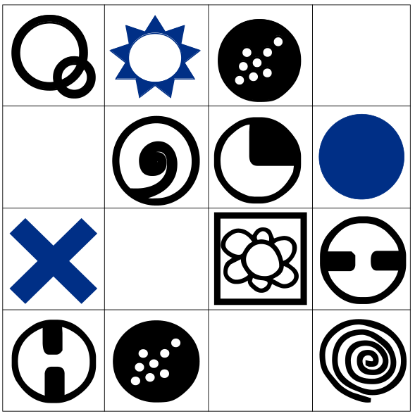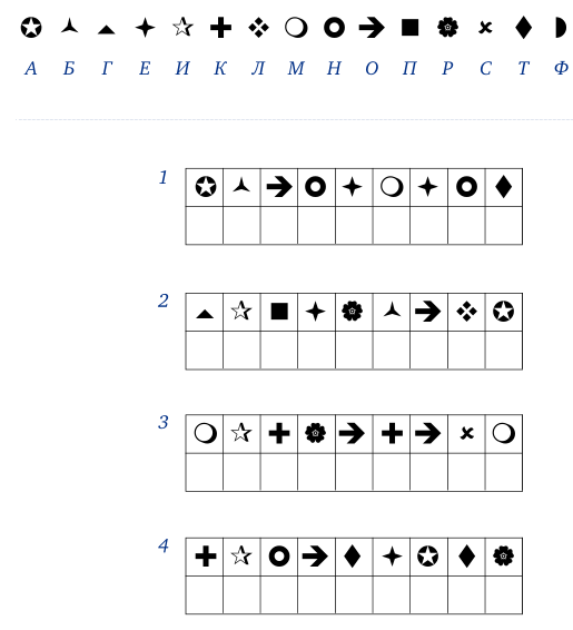 7. В течение двух минут запоминайте изображенные на верхней картинке буквы и связанные с ними символы. Затем закройте картинку и составьте на основании символов четыре слова в клетках, расположенных внизу.