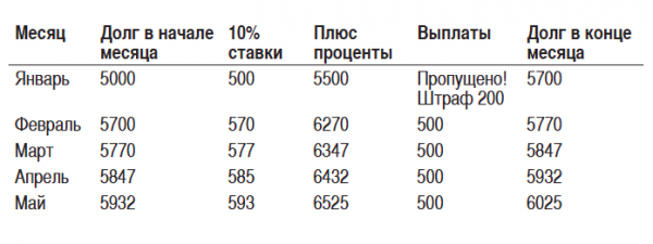 Если в течение года вы не погасите кредит в 5000 рублей, то через 12 месяцев ваш долг составит 5000 х 3,14 = 15 700 рублей. Разумеется, чтобы долг не доходил до таких сумм, нужно совершать регулярные выплаты.