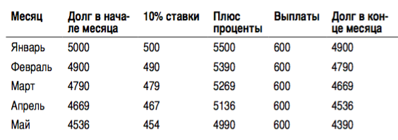 Если платить чуть больше (скажем, 600 рублей), заемная сумма в 5000 рублей начнет уменьшаться — сначала понемногу, но со временем все быстрее и быстрее, и однажды вы погасите долг целиком. Числа в следующей таблице округлены до ближайших целых сумм в рублях.