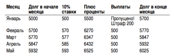 Если в течение года вы не погасите кредит в 5000 рублей, то через 12 месяцев ваш долг будет составлять уже 5000 × 3,14 = 15 700 рублей. Разумеется, чтобы этого не произошло, нужно вовремя совершать выплаты.