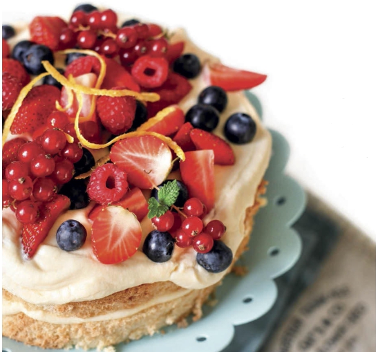 12. Выложите половину получившегося крема на нижний корж. Накройте вторым коржом и выложите оставшийся крем. Украсьте ягодами и подавайте.