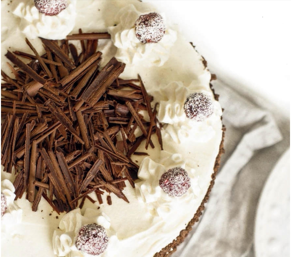 15. Бока торта обсыпьте шоколадной крошкой, в середине выложите шоколадную стружку. Отсадите розетки из сливок по краю торта.