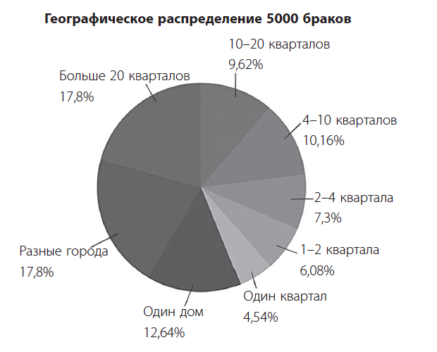 Ясно, что в наше время все не так. Оказалось, что социологи вообще не изучают географию браков, заключенных в том или ином городе. Лично у меня нет знакомых, которые были бы женаты или замужем за человеком, жившим по соседству. В большинстве случаев мои друзья женились на тех, кого встретили уже после окончания университета, — людях из других уголков страны, а иногда — и мира.