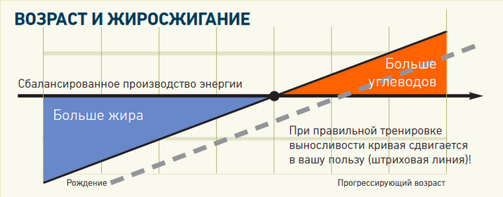 Многие с возрастом теряют способность удерживаться в области жирообмена. Я должен пояснить, как меняется энергообеспечение наших мышц в течение жизни. Когда мы были маленькими детьми, мы черпали энергию почти исключительно в области жирообмена.