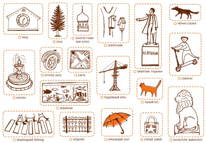 14. Играйте! Отличный вариант для тех, у кого есть дети, — игры-находилки. Например, можно предложить ребенку найти за день все эти предметы: часы, елка, купол, скворечник, фонтан, круглое окно, карта, самокат, аквариум, подъемный кран, сердечко, оранжевый зонт, черная собака, памятник Пушкину, старый замочек, пешеходный переход, скульптура животного, рыжий кот. Такой квест сделает незабываемым даже пасмурный осенний день.