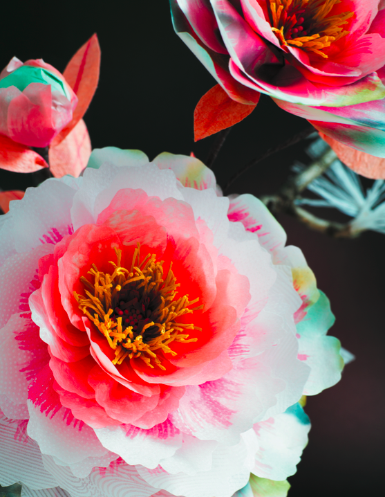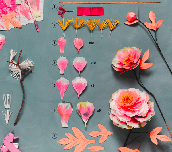 8. Хвоя. Сплиссируйте часть белой креповой бахромы и приклейте к ветке пистолетом. Для маленьких пионов в шагах 1 и 2 используйте три сердцевины из желтого шпагата, а в шагах 3 и 7 в два раза уменьшите количество лепестков.