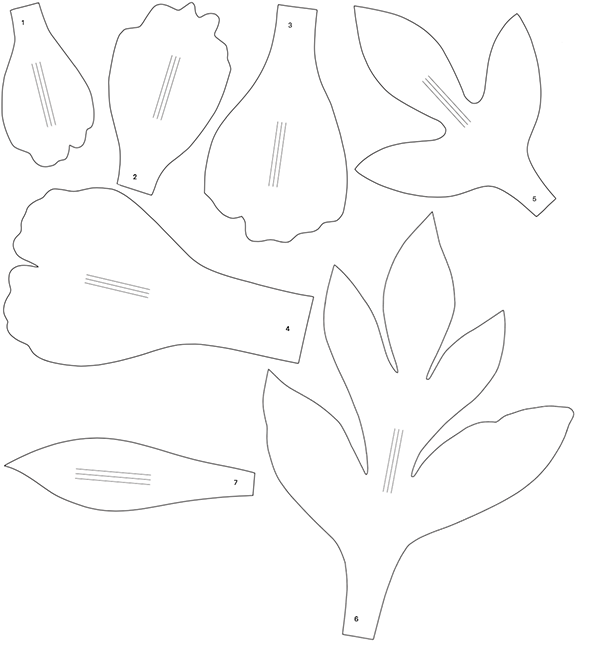 4–7. Повторите шаг 3 с лепестками No 2 (10 пар), No 3 и 4 (по 9 пар). Сплиссируйте все листья. Обматывая стебель, прикрепите лист No 7 на 2,5 см ниже основания, а листья No 5 и 6 — к разным отрезкам проволоки, обмотав каждый. Объедините их с основным стеблем.